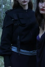 Made from 100% Wool coating with a padded orange lining of 100% Silk, the Strapped Bomber supports a glasses pocket on the front chest, a lighter utility pocket on the left arm, two fleece lined hand pockets as well as three inner pockets. Adjustable cotton strapping is draped from the back left shoulder of the garment and secured on the right of the chest with metal hardware, adorned with a hand cut leather tassel.
