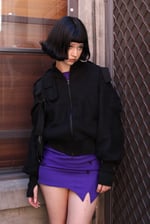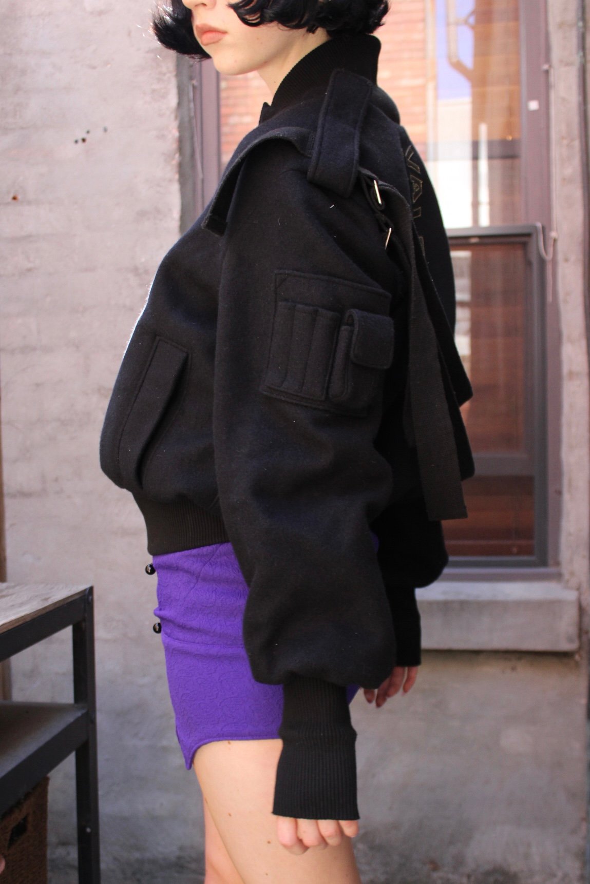This Bomber is a one of two piece. There are two Strapped Bomber, one size small with an orange silk lining and one size large with a purple silk lining.